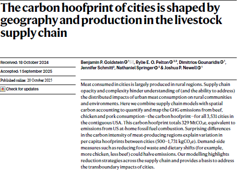 Meat consumed in cities is largely produced in rural regions. Supply chain opacity and complexity hinder understanding of (and the ability to address) the distributed impacts of urban meat consumption on rural communities and environments. Here we combine supply chain models with spatial carbon accounting to quantify and map the GHG emissions from beef, chicken and pork consumption—the carbon hoofprint—for all 3,531 cities in the contiguous USA. This carbon hoofprint totals 329 MtCO2e, equivalent to emissions from US at-home fossil fuel combustion. Surprising differences in the carbon intensity of meat-producing regions explain variation in per capita hoofprints between cities (500–1,731 kgCO2e). Demand-side measures such as reducing food waste and dietary shifts (for example, more chicken, less beef) could halve emissions. Our modelling highlights reduction strategies across the supply chain and provides a basis to address the transboundary impacts of cities.