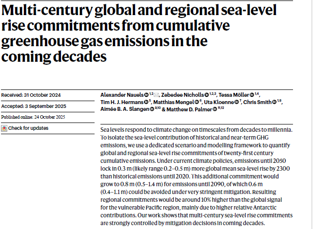 Sea levels respond to climate change on timescales from decades to millennia. To isolate the sea-level contribution of historical and near-term GHG emissions, we use a dedicated scenario and modelling framework to quantify global and regional sea-level rise commitments of twenty-first century cumulative emissions. Under current climate policies, emissions until 2050 lock in 0.3 m (likely range 0.2–0.5 m) more global mean sea-level rise by 2300 than historical emissions until 2020. This additional commitment would grow to 0.8 m (0.5–1.4 m) for emissions until 2090, of which 0.6 m (0.4–1.1 m) could be avoided under very stringent mitigation. Resulting regional commitments would be around 10% higher than the global signal for the vulnerable Pacific region, mainly due to higher relative Antarctic contributions. Our work shows that multi-century sea-level rise commitments are strongly controlled by mitigation decisions in coming decades.